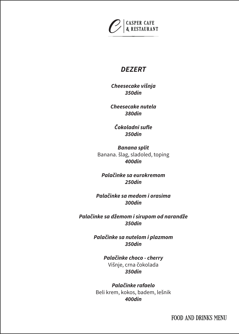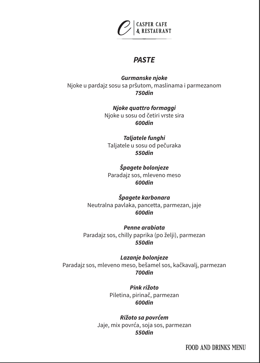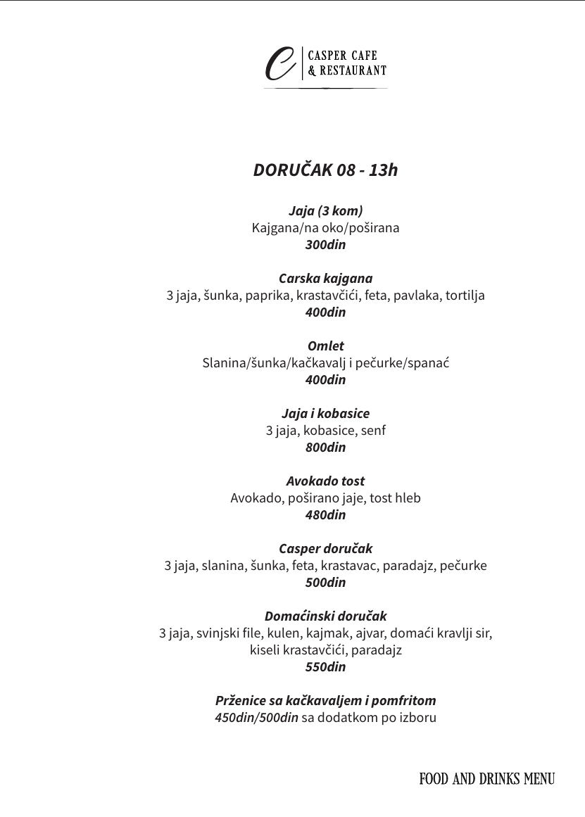 Welcome to Casper Cafe & Restaurant, nestled in the vibrant heart of Bor, Serbia. This culinary gem offers a fantastic array of burgers and pizzas that cater to every palate. Whether you're craving a hearty Casper Burger or the classic flavors of a Margarita Pizza, each dish is crafted with quality ingredients and creativity.